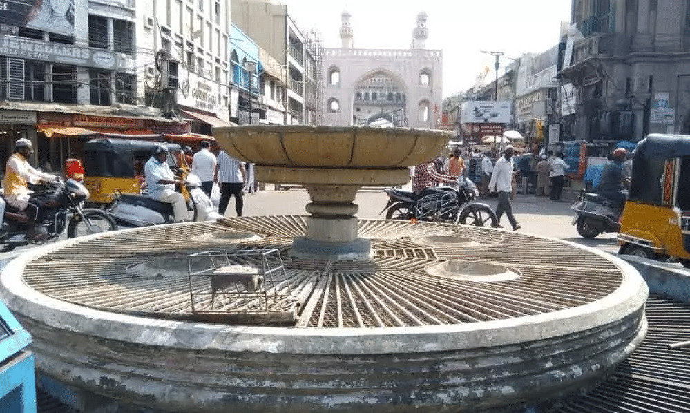 Derelict Historical Site: One of the engineers of the Quli Qutub Shah Urban Development Authority (QQSUDA) described the dilapidated condition of the structure. The structure was overgrown with algae and debris from the fountain made into the three-tier drain. Dense traffic still remains a challenge for the restoration of the defunct fountain. This structure, post-restoration, is said to be one of the welcoming points to Charminar.